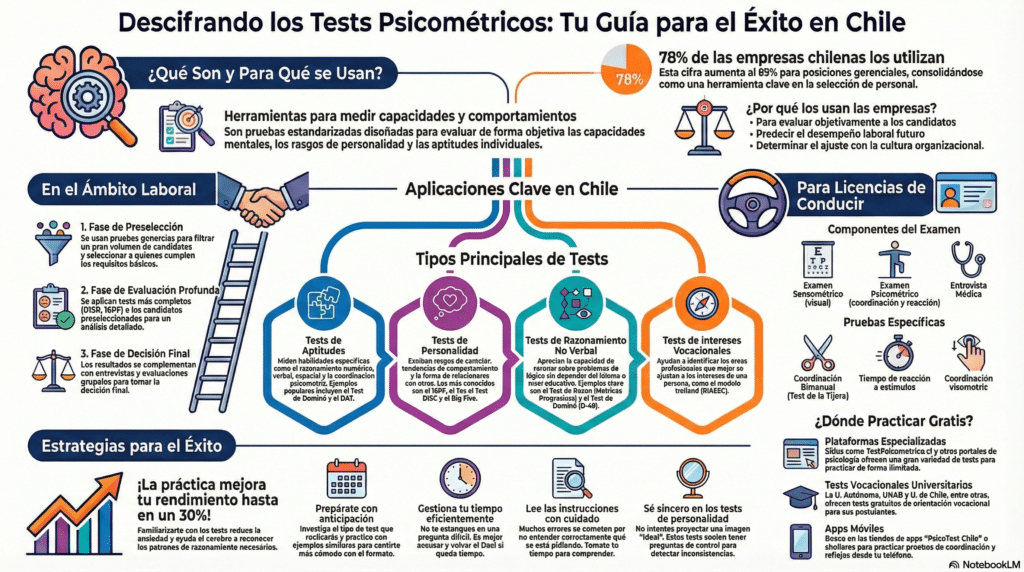 En el competitivo mercado laboral chileno de 2026, las pruebas psicométricas se han consolidado como herramientas fundamentales en procesos de selección, orientación vocacional y desarrollo profesional. Según datos del Instituto Nacional de Estadísticas (INE), el 78% de las empresas chilenas utiliza algún tipo de evaluación psicométrica en sus procesos de contratación, cifra que aumenta al 89% en posiciones gerenciales.