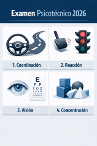 | Examen Psicotécnico | Coordinación, reacción, atención | 30-60 min | Sí |